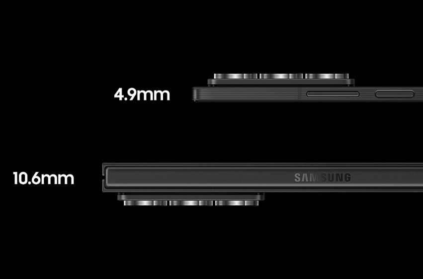 갤럭시 Z폴드 SE는 블랙 쉐도우 색상으로 출시되며, 메탈과 유리 소재를 조화롭게 사용하여 현대적인 스트라이프 패턴을 적용했습니다. 두께는 10.6mm, 무게는 236g으로, 이전 모델보다 더 얇고 가벼워졌습니다.