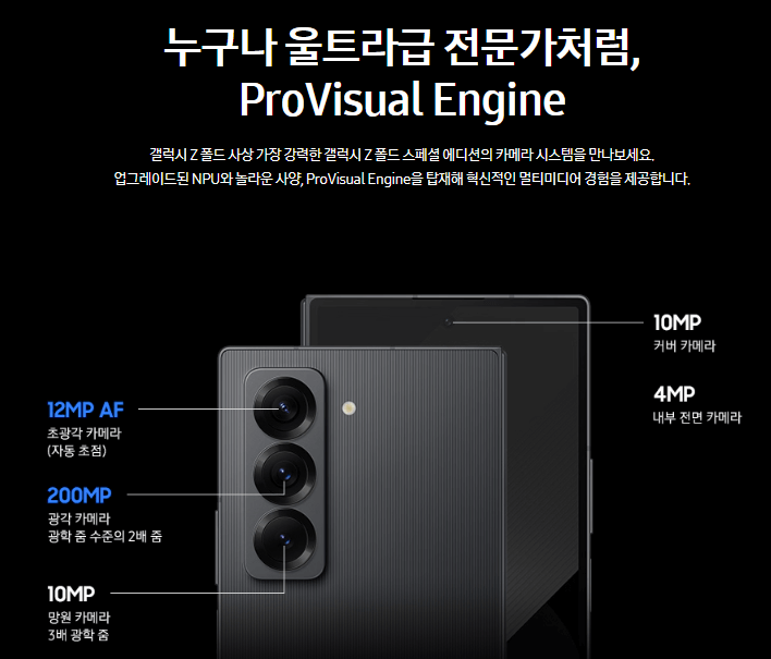 2억 화소의 광각 카메라를 탑재하여, 폴더블폰에서 이 정도의 카메라는 처음입니다. 이전 모델에서 지적되었던 셀피 카메라의 품질도 개선되어 더 선명한 사진 촬영이 가능해졌습니다. 다만, 얇아진 두께로 인해 S펜 기능은 제외되었습니다.
